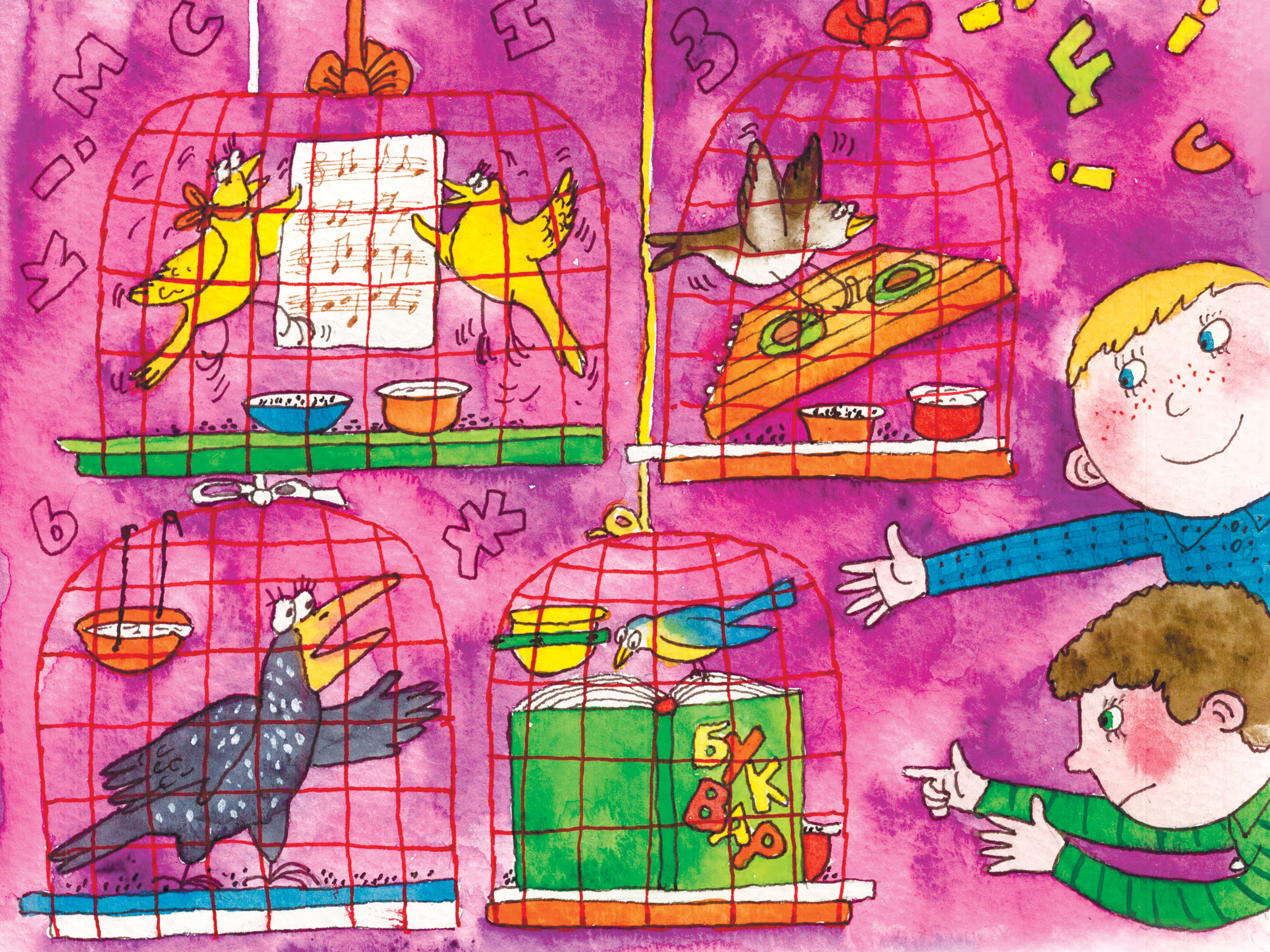 – Ну што, мае маленькія, што, шчабятушкі? – ласкава загаварыў з птушкамі Косцік. – Сумавалі без мяне? Зараз пачышчу ў вас. Хто ў чым сёння хоча пакупацца – у пяску ці ў вадзе?