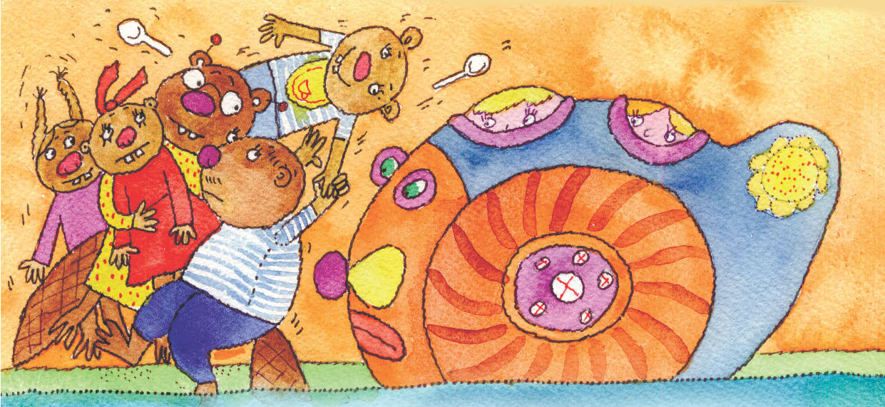 Батыскаф, з разгону ўрэзаўшыся ў бабрыную хатку, таксама імгненна ўсплыў на паверхню. Лось Савось стаў, як укапаны. Выдра Лупыдра выскачыла з вады і кінулася наперарэз бабрынай сямейцы. Кожнаму яна ўсунула па візітоўцы – і бабру Рыгору, і бабрысе Рыгорысе, і бабранятам-Рыгаранятам.