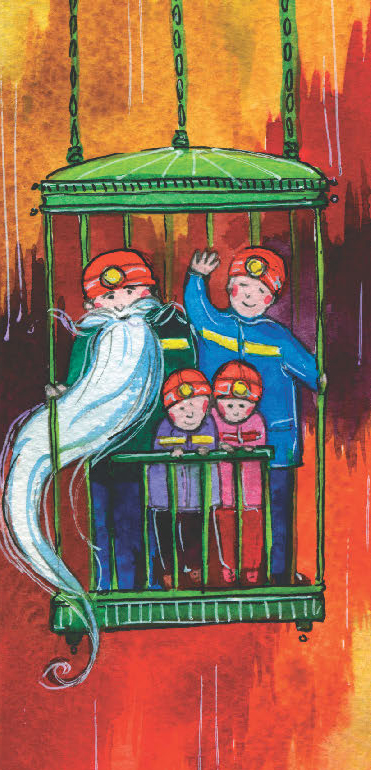 Праз колькі хвілін нашы вандроўнікі сталі амаль непазнавальнымі. У каляровых, грубаватых спяцоўках, у аранжавых шлемах з лямпачкай-ліхтарыкам, яны былі гатовы да спуску ў падзямелле.