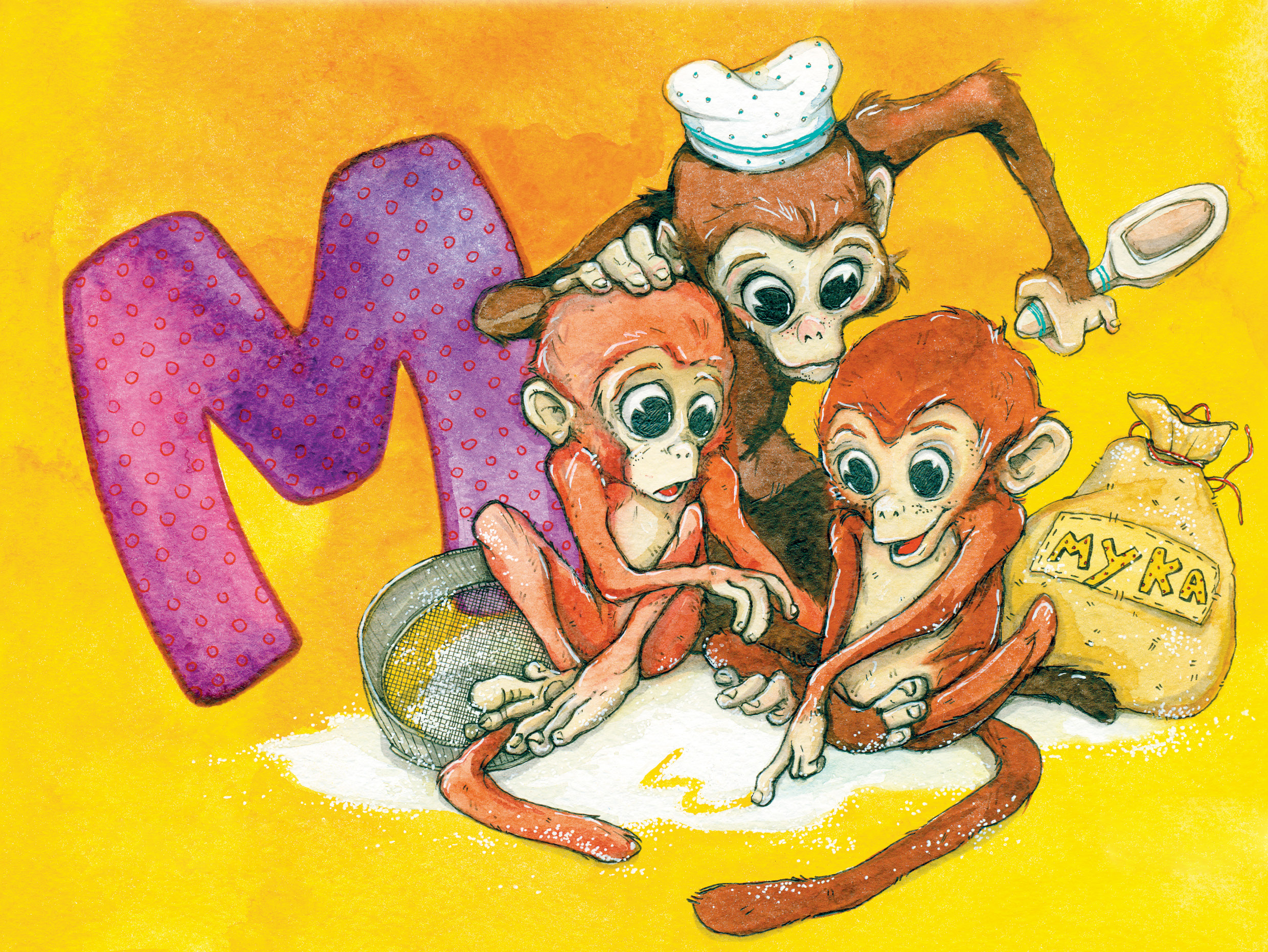 Мама Малпа малола муку. Малпяняты Мікі і Мукі памагалі. Мікі – мукамол. Мукі – мукасей.